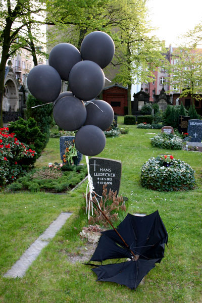 Maria Cyber photo and Comment: We redecorate the tombstones by leaving our things around. I found it a nice photo, next to the unknown to me, pure guy who is lying under his gravestone, the black balloons and the broken umbrella match perfect, I think. Of course before we leave the location we cleaned everything up. I believe that the guy under the gravestone would never imagine that his tombstones would be at the Bruce LaBruce internet Blog.